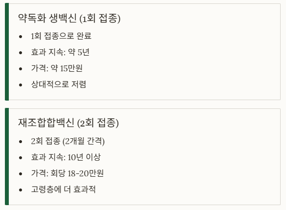 약독화 생백신은 저렴하지만 지속력이 짧고, 재조합백신은 비용이 더 들지만 효과가 오래갑니다.