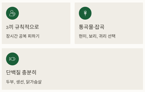 - 3끼 규칙적으로 먹기 → 장시간 공복 피하기