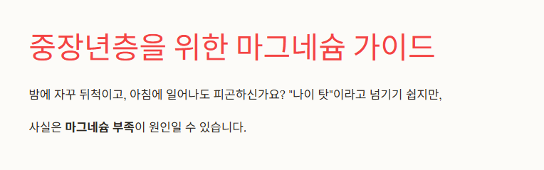 - 수면 문제: 50대 이후 불면·수면 중단 빈번 → 마그네슘 섭취로 신경 안정 도움