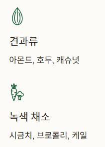 - 채소: 시금치, 브로콜리
