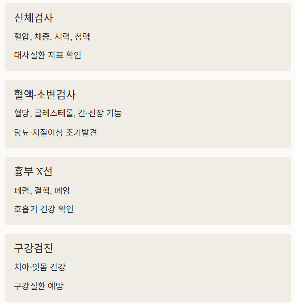| 기본 신체검사 | 혈압, 체중, 시력, 청력, 비만도 | 대사질환 및 노화 관련 지표 확인 | 2년마다 |