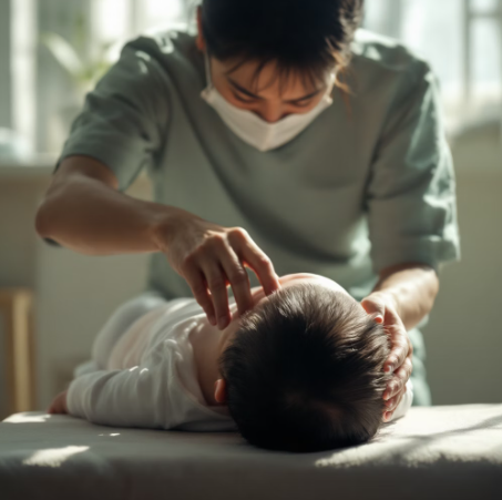 - 아기를 뒤집어 천장을 향하게 눕힌 후,