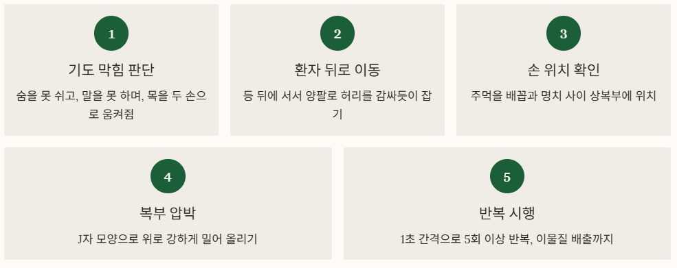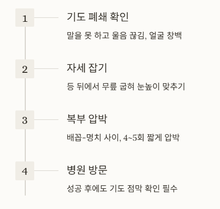 - 한 번의 압박으로 이물질이 빠질 수 있으므로 “강하고 짧게, 위쪽으로” 밀어올리는 게 핵심입니다.
