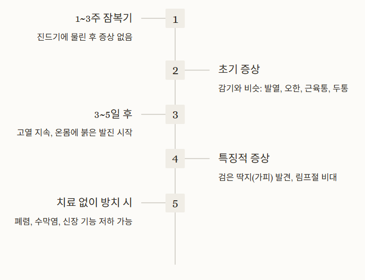 | 잠복기 | 보통 1 ~ 3주 (진드기 물린 뒤) | 초기엔 감기 증상 비슷: 발열, 오한, 근육통, 두통 등 |
