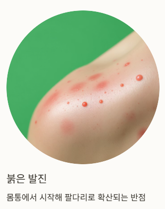 | 피부 증상 | 발진 (몸통 중심 → 팔다리 쪽으로 확산) | 반점상 구진, 홍반성 병변 (약 3~5 mm 크기) |