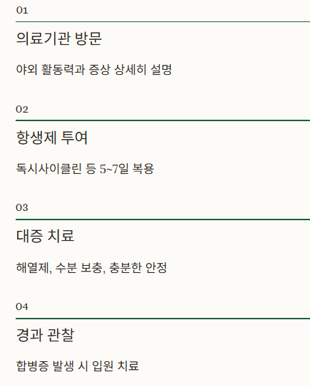 - 치료는 보통 5~7일 정도 투여하며, 조기 치료 시 완치 가능