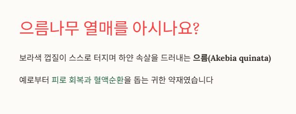 기력 회복, 면역력 강화, 피로 감소에 도움을 줍니다. - 농촌에서는 예로부터 “몸이 허할 때 으름 먹는다”는 말이 있을 정도로 알려져 있습니다.