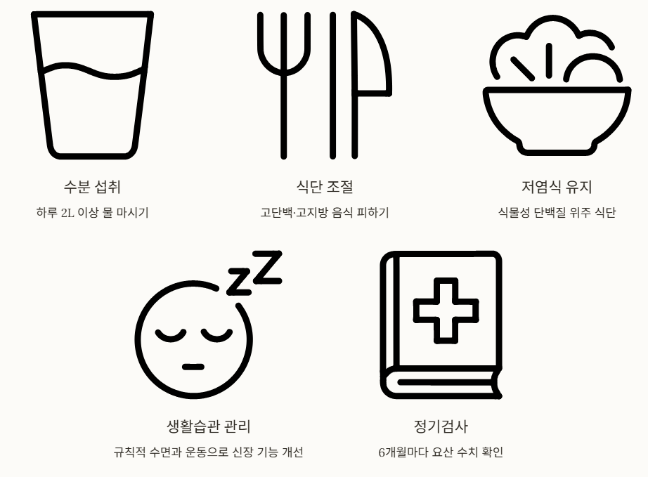 | 신장결석 | 옆구리 통증, 소변 시 통증 | 요산이 돌처럼 굳어 요로를 막음 |