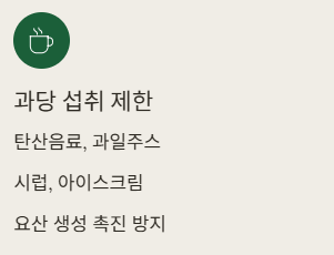 - 탄산음료, 과일주스, 시럽, 아이스크림 섭취를 줄이세요.