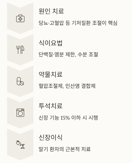 | 식이요법 | 단백질·염분 제한, 수분 조절 |