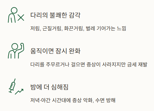 | 움직이면 완화 | 다리를 주무르거나 걸으면 증상 완화 |