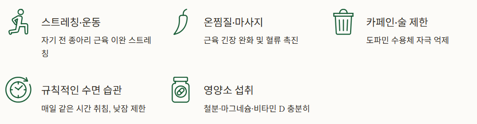 | 카페인·술 제한 | 도파민 수용체 자극 억제 |
