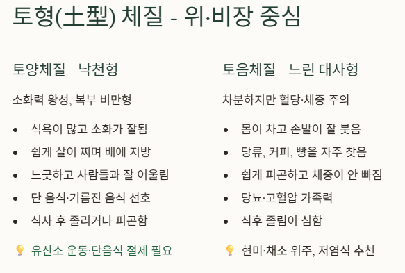 | 토형(土型) | 토양체질, 토음체질 | 위·비장이 강함, 소화력 좋음 |