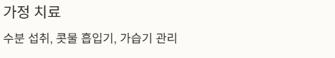 | 가정 치료 | 수분 섭취 유지, 콧물 흡입기 사용, 가습기 관리 |