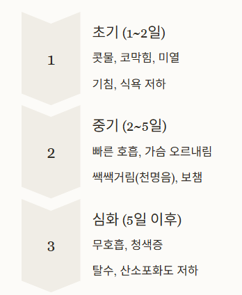 | 심화 (5일 이후) | 무호흡, 청색증(입술·손톱 푸름), 탈수, 산소포화도 저하 |