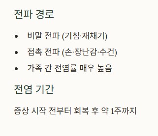 | 전염 가능 기간 | 증상 시작 전부터 회복 후 약 1주까지 |