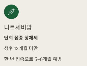 단회 접종 항체제 | 생후 12개월 미만 영아 | 한 번 접종으로 5~6개월간 예방효과 유지 |