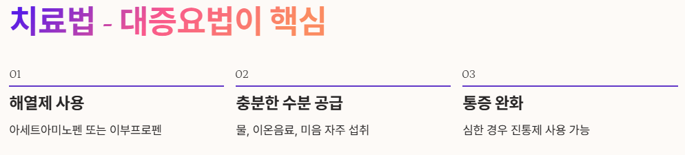 - 수분 공급: 탈수 방지를 위해 물, 이온음료, 미음 등 자주 먹이기