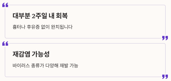 ❗감염 후에도 2~3주간 바이러스가 대변에서 배출되므로, 완치 후에도 손 위생을 철저히 해야 합니다.