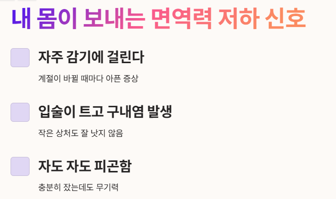 감기, 피부트러블, 피로감 등은 단순한 컨디션 문제가 아니라 면역력 저하의 신호일 수 있어요.