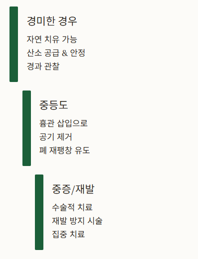 - 중증인 경우: 흉관 삽입으로 공기 제거, 폐 재팽창 유도