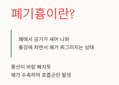 - 병이 진행되면서 폐 조직이 약해져 공기가 흘러나옴
