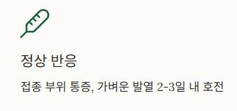 - 접종 부위 통증, 가벼운 발열은 정상 반응 (2~3일 내 호전)