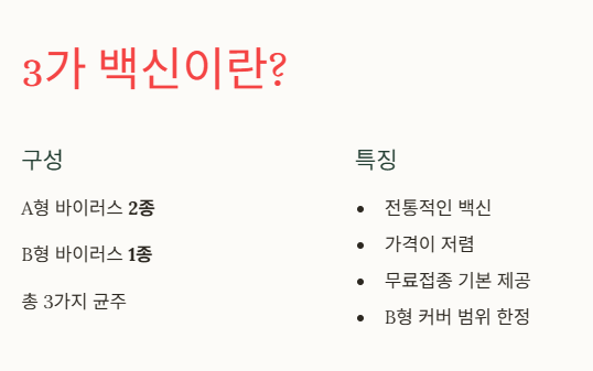 - 구성: A형 바이러스 2종 + B형 바이러스 1종 = 총 3가지 균주
